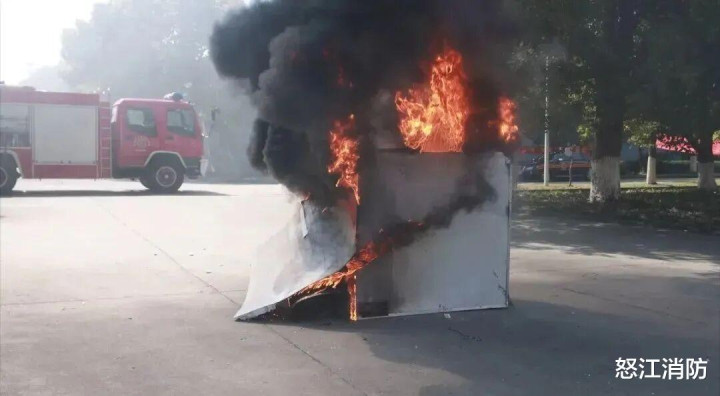 在试验中,消防员用泡沫夹芯板搭建起一个箱子,模拟厂房。当消防员点燃其中一角时,可以看到,彩钢板迅速被引燃,大量毒气冒出。
